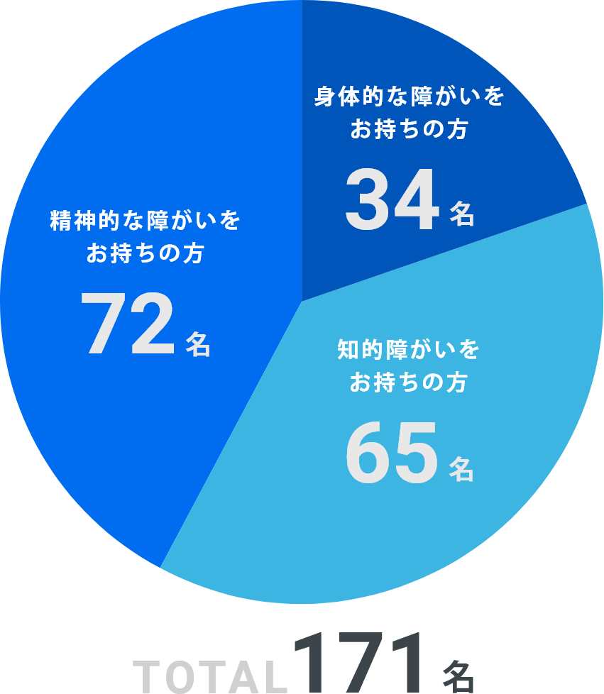 それぞれの障害をお持ちの方が総勢171名(2023年3月現在)働いています。